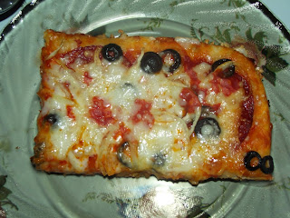 Cand vrem sa preparam pizza, intindem o foaie (foarte subtire) de marimea si forma dorita. Eu am facut-o in tava de la cuptor si am pus pe aluat ulei de masline, salsa de pomodorro, chorizo de pamplona, ceapa, masline si mozzarella. Arata cam asa si e foarte buna.
