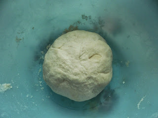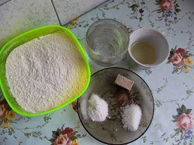 Se pune intr-un castronel drojdia amestecata cu 1 lingura de faina, 3-4 linguri de apa calda (din cele 150 ml) si zaharul, si se amesteca pana rezulta o pasta. Se acopera si se lasa pana ce drojdia face spuma la suprafata. Intr-un alt castron se pune faina, iar in mijlocul ei se toarna amestecul de drojdie (cel preparat mai sus), uleiul, sarea, restul de apa, si se amesteca, pentru a forma un aluat moale si elastic. Cand aluatul incepe si se leaga, se incepe si se framanta bine, dupa care se lasa deoparte, acoperit, sa dospeasca timp de 40-45 minute.