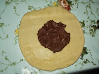 Lasam aluatul la dospit pentru 30-40 minute. Aluatul se portioneaza in bucati cit un mar si se lasa sa se odihneasca 15 minute. Se intinde o foaie cu sucitorul si se pune fineti in mijloc. Se aduna colturile placintei si mai intindem cu sucitorul peste avand grija sa nu o subtiem prea tare ca iasa umplutura.