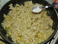 Punem pastele la fiert in apa cu putina sare si ulei pentru a nu se lipii pastele intre ele. Intre timp tocam pieptul de pui si ceapa. Intr-o tigaie punem 2-3 linguri de ulei si punem ceapa la calit.