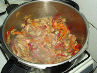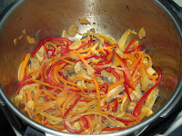 Morcovii, ardeiul si cipercutele se curata si se taie julienne, pieptul de pui il taiem cubulete. Uleiul de masline se pun la incins intr-un wok sau o cratita in cazul meu. Se adauga morcovul si ardeiul si se calesc 3 minute la foc mare.