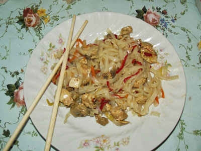 Intre timp, taiteii se pun la inmuiat in apa fierbinte conform instructiunilor de pe pachet. Se scurg taiteii si se adauga peste legume si pui. Se adauga piperul, curry si se amesteca.